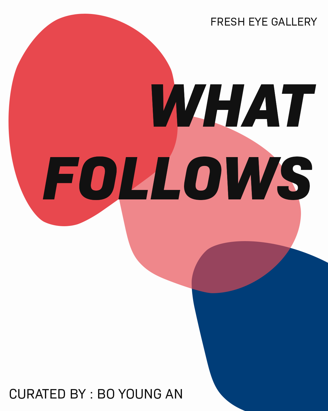 Graphic with text and abstract images. Three organic shapes in red, medium pink, and blue, sit in a line from the top left corner to the bottom right. Text reads: “Fresh Eye Gallery; What Follows; Apply by 3.22; Call for Art; Curated by: Bo Young An”