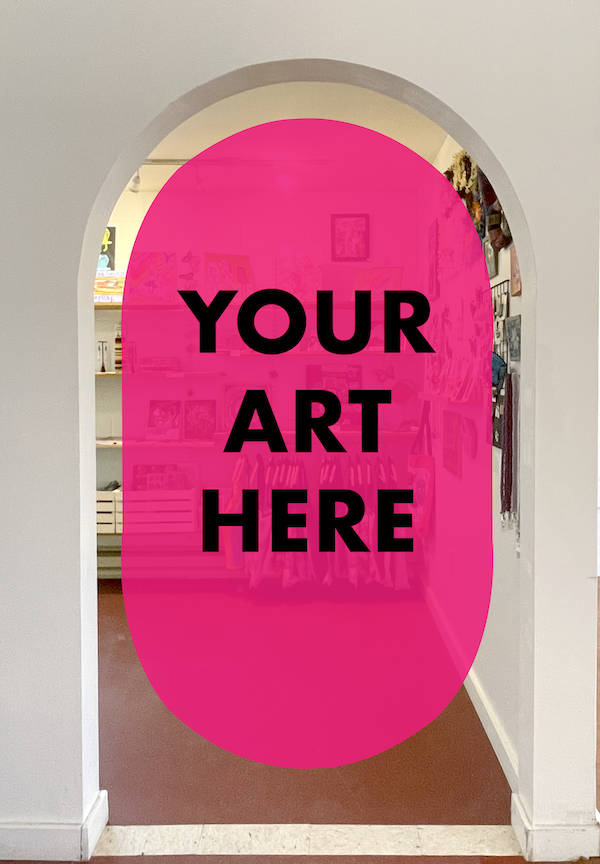 An image of the doorway of the Fresh Eye Gallery Gift Shop with a bright pink oval graphic and black text that reads, "YOUR ART HERE"