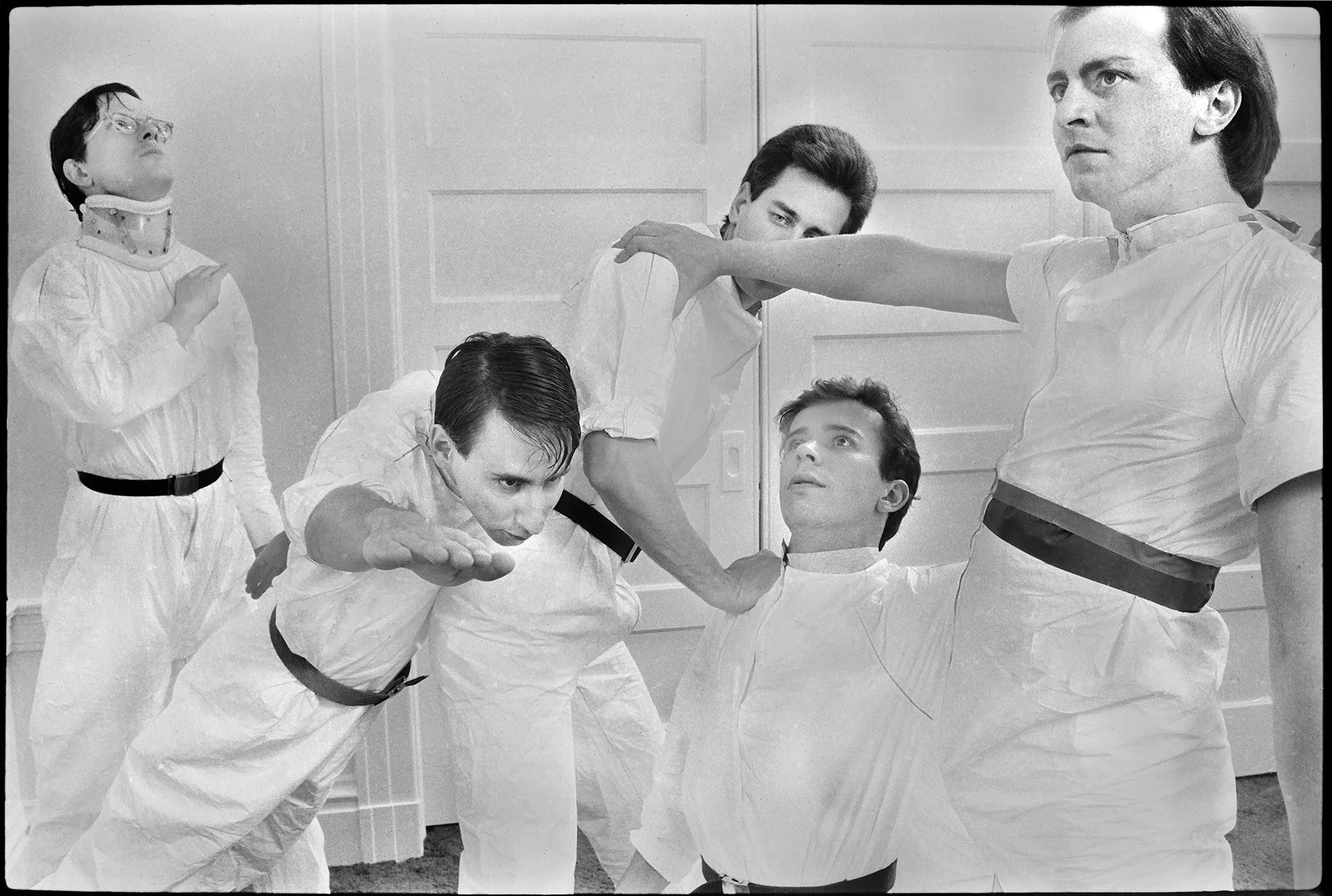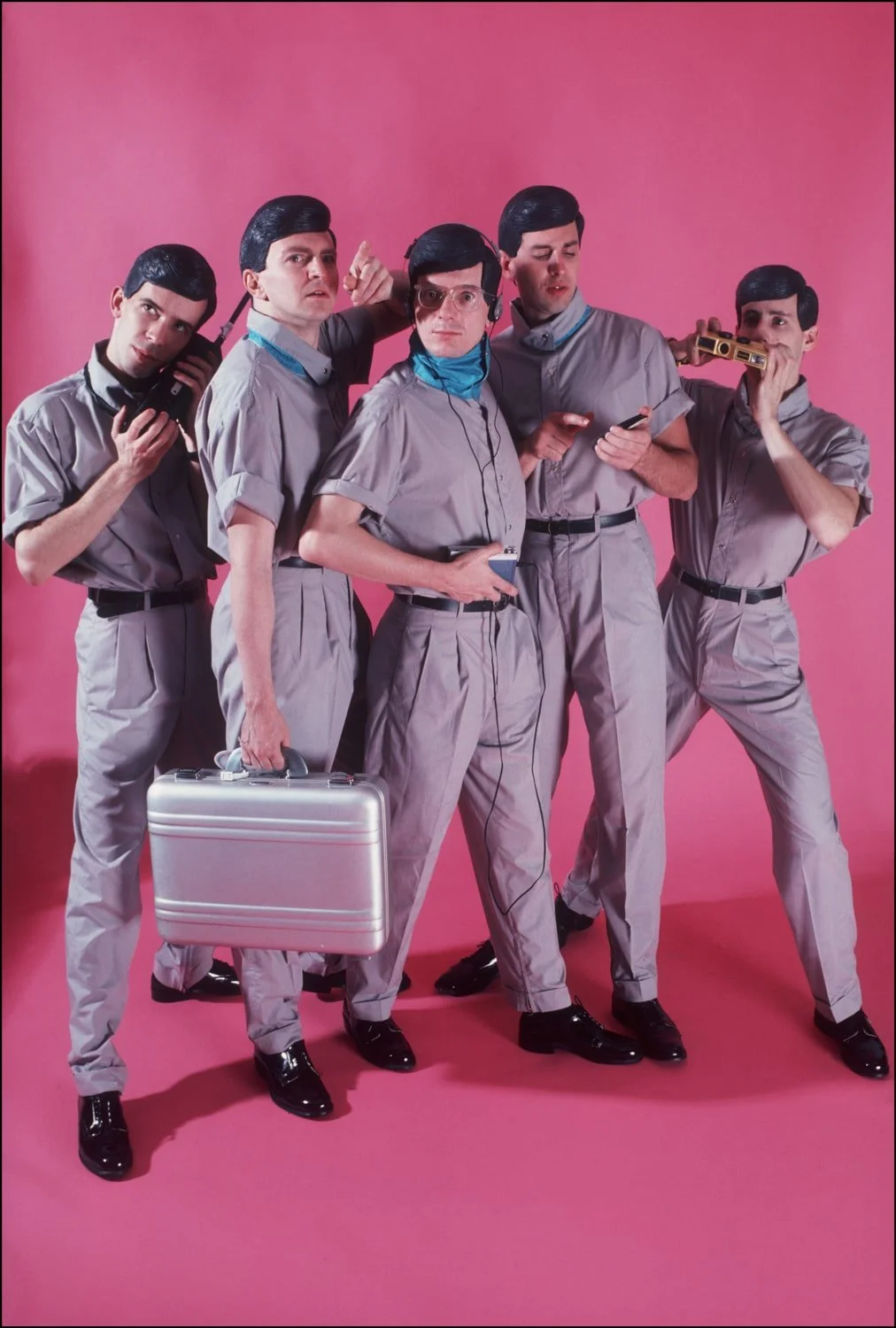 ID: Members of the band DEVO wearing matching teal and black outfits and shiny black plastic hair, gather around to look at a GQ magazine.