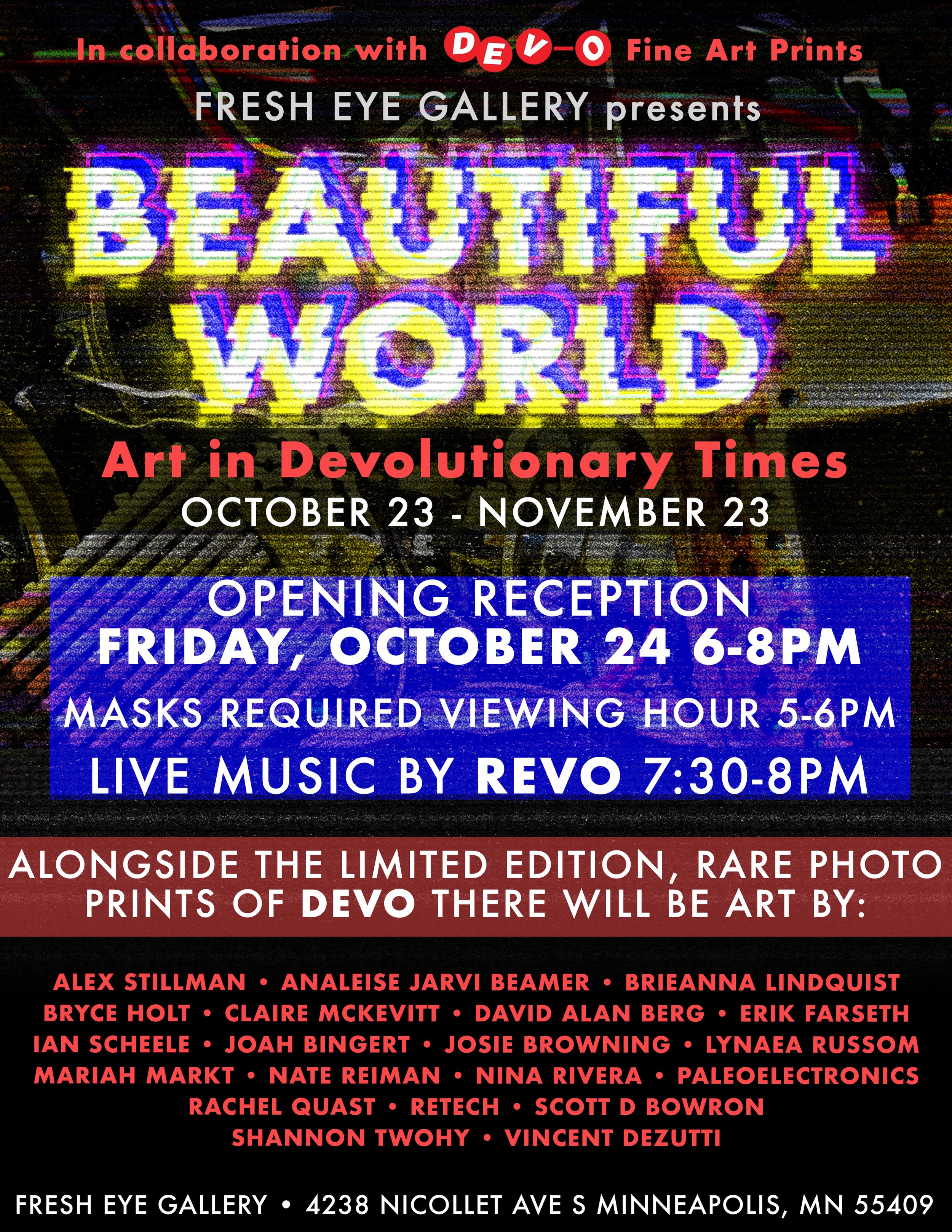 ID: A promotional image for BEAUTIFUL WORLD featuring red and white text on a black background with distorted lines and textures in the background. Text reads "In collaboration with DEV-O Fine Art Prints/ Fresh Eye Gallery Presents / BEAUTIFUL WORLD / Art in Devolutionary Times /October 23-November 23/Opening Reception Friday October 24 6-8pm/ Masks required viewing hour 5-6pm/ live music by REVO 7:30-8pm /Alongside the limited edition, rare photo prints of DEVO there will be art by: / Alex Stillman, Analeise Jarvi Beamer, BrieAnna Lindquist, Bryce Holt, Claire McKevitt, David Alan Berg, Erik Farseth, Ian Scheele, Joah Bingert, Josie Browning, Lynaea Russom, Mariah Markt, Nate Reiman, Nina Rivera, Paleoelectronics, Rachel Quast, Retech, Scott D Bowron, Shannon Twohy, Vincent Dezutti/ Fresh Eye Gallery/ 4238 Nicollet Avenue, Minneapolis MN 55409"Hang onto your energy domes, people! We are thrilled to announce BEAUTIFUL WORLD, Art in Devolutionary Times. Inspired by a collaboration with DEVO Fine Art Prints, we’ve collected a mix of artwork that aligns with the concepts behind the influential and legendary band DEVO!