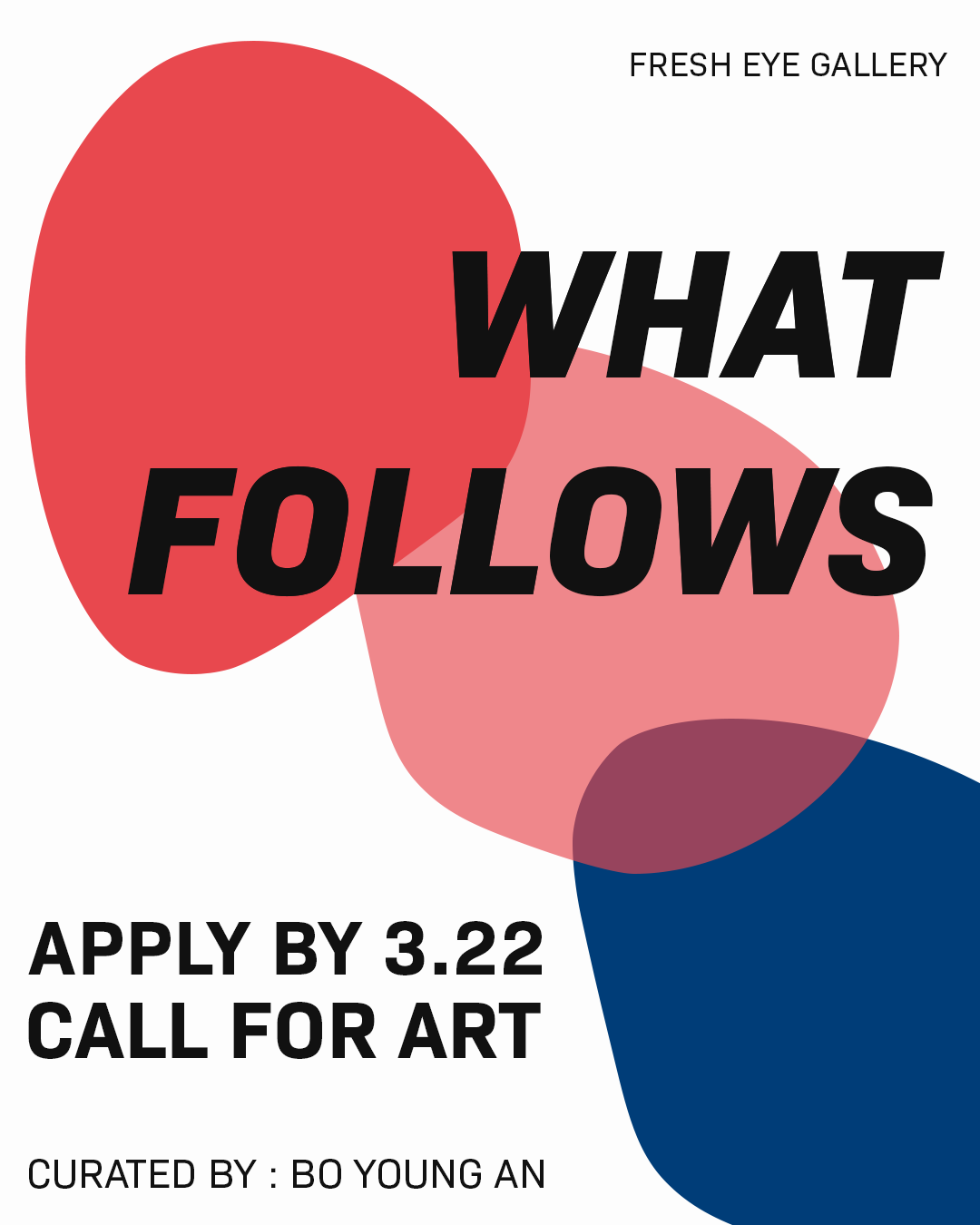 ID: Graphic with text and abstract images. Three organic shapes in red, medium pink, and blue, sit in a line from the top left corner to the bottom right. Text reads: “Fresh Eye Gallery; What Follows; Apply by 3.22; Call for Art; Curated by: Bo Young An”